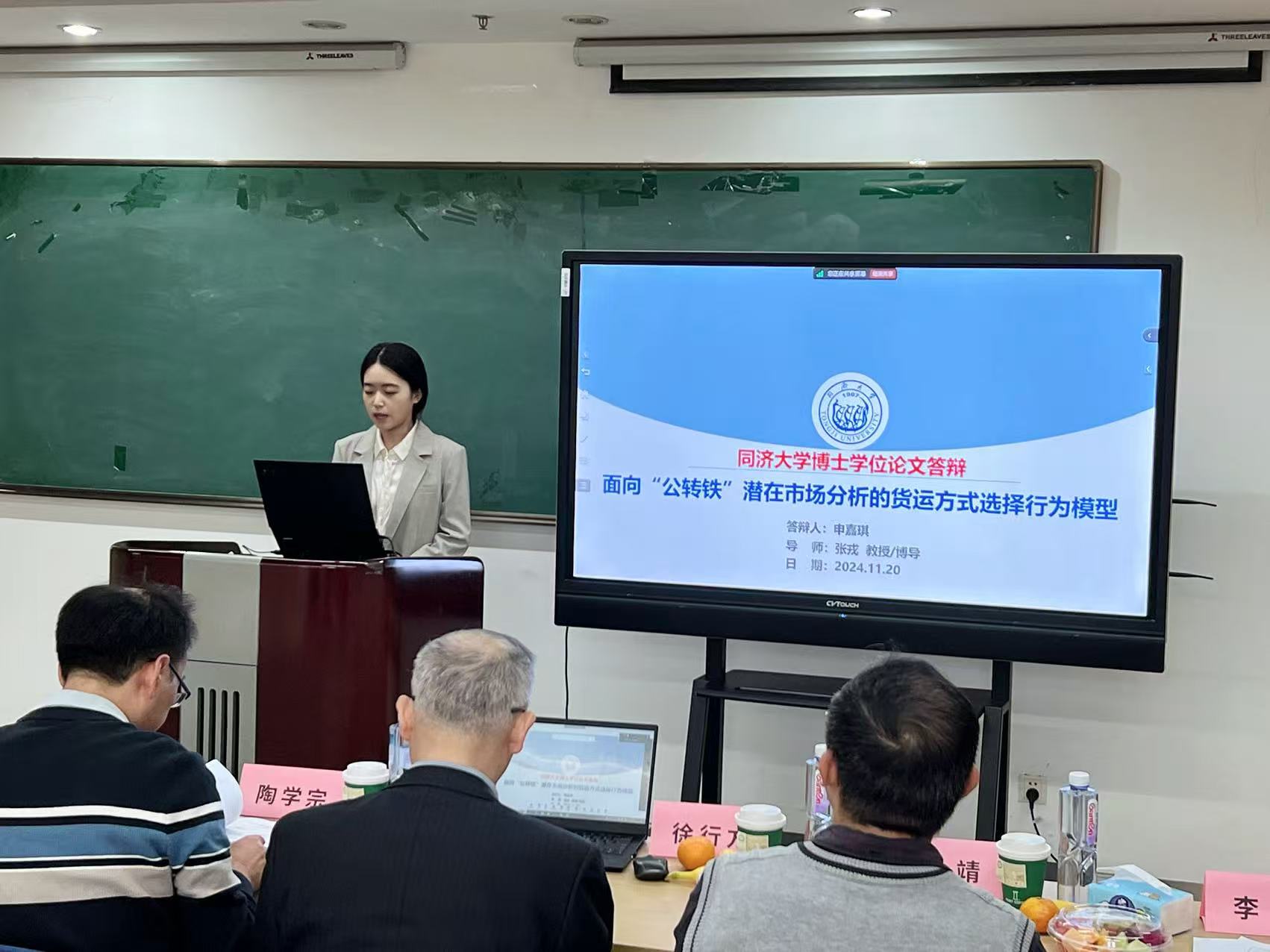 2024年11月20日下午2点,课题组博士研究生申嘉琪进行了博士学位毕业论文答辩,论文题目是面向“公转铁”潜在市场分析的货运方式选择行为模型,指导老师是张戎教授,答辩委员会由同济大学徐行方教授、中国铁道科学研究院郑平标研究员、上海海事大学陶学宗副教授、同济大学滕靖教授、同济大学李浩教授和同济大学张戎教授组成,徐行方教授担任答辩主席,张岑特聘研究员担任答辩委员会秘书。